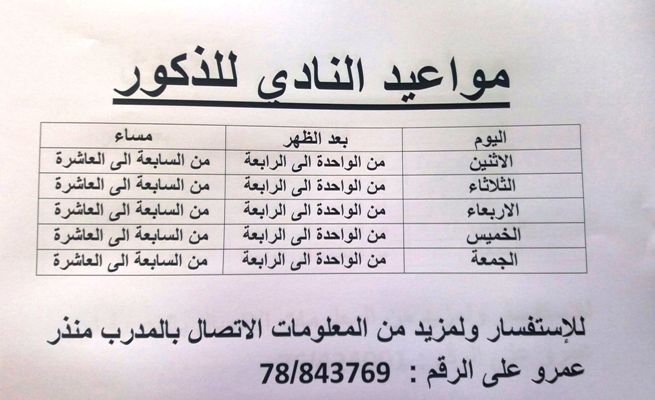 بسمه تعالى اهلنا الكرام نحيطكم علماً بتعديل دوام نادي اللياقة البدنية للذكور والاناث اعتبارا من تاريخ 1/7/2018 لتصبح على الشكل التالي :