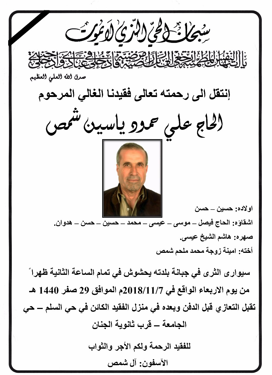 سيوارى الثرى في جبانة بلدته يحشوش في تمام الساعة الثانية ظهراً من يوم الاربعاء الواقع في 7-11-2018 . تقبل التعازي قبل الدفن وبعده في منزل الفقيد الكائن في حي السلم – حي الجامعة – قرب ثانوية الجنان