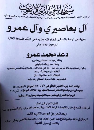 بمزيد من الآسى والحزن ننعي اليكم وفاة المرحومة الحاجة دعد محمد مشرف عمرو (أم سعد) ارملة المرحوم احمد بعاصيري التي وافتها المنية اليوم الاثنين بتاريخ 9/3/2020 حيث سيصلى على جثمانها الطاهر غداً الثلاثاء الواقع بتاريخ 10/3/2020 بعد صلاة الظهر في مسجد الغفران في صيدا وتوارى الثرى في مقبرة صيدا الجديدة