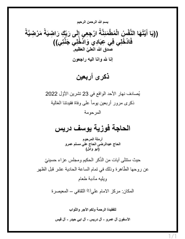يصادف نهار الاحد الواقع في 22/1/2023 ذكرى مرور أربعون يوماً على وفاة فقيدنا الغالي