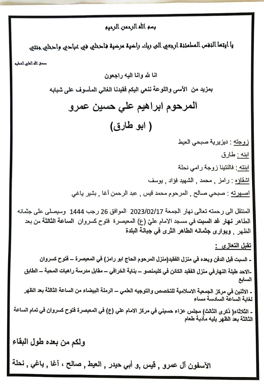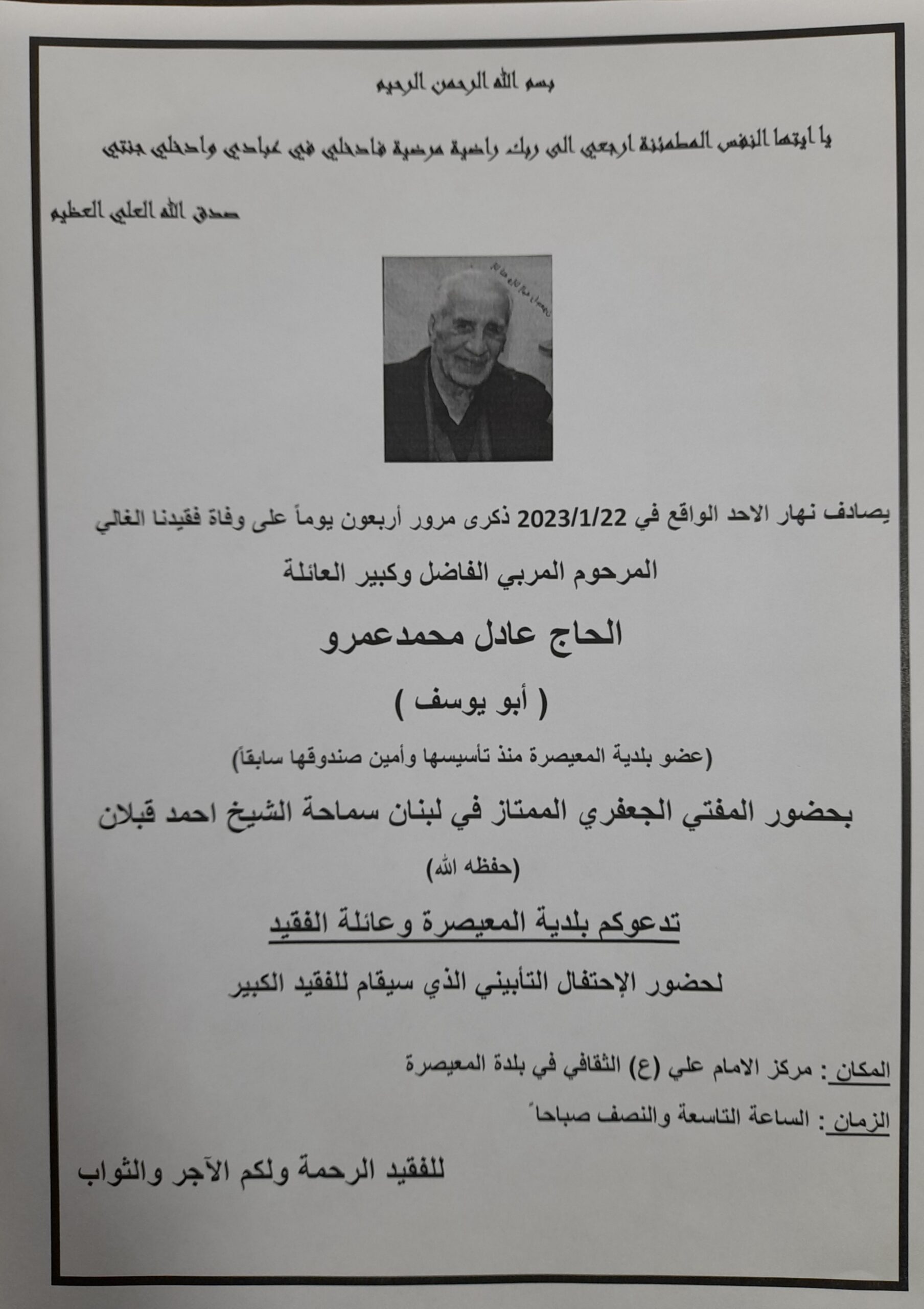 الذي انتقل الى رحمة الله تعالى اليوم الثلاثاء الواقع في ٢١ شباط ٢٠٢٣ وسيصلى على جثمانه الطاهر اليوم في تمام الساعة الثانية من بعد الظهر في مسجد الامام علي (ع) في المعيصرة ويوارى جثمانه الطاهر في جبانة البلدة