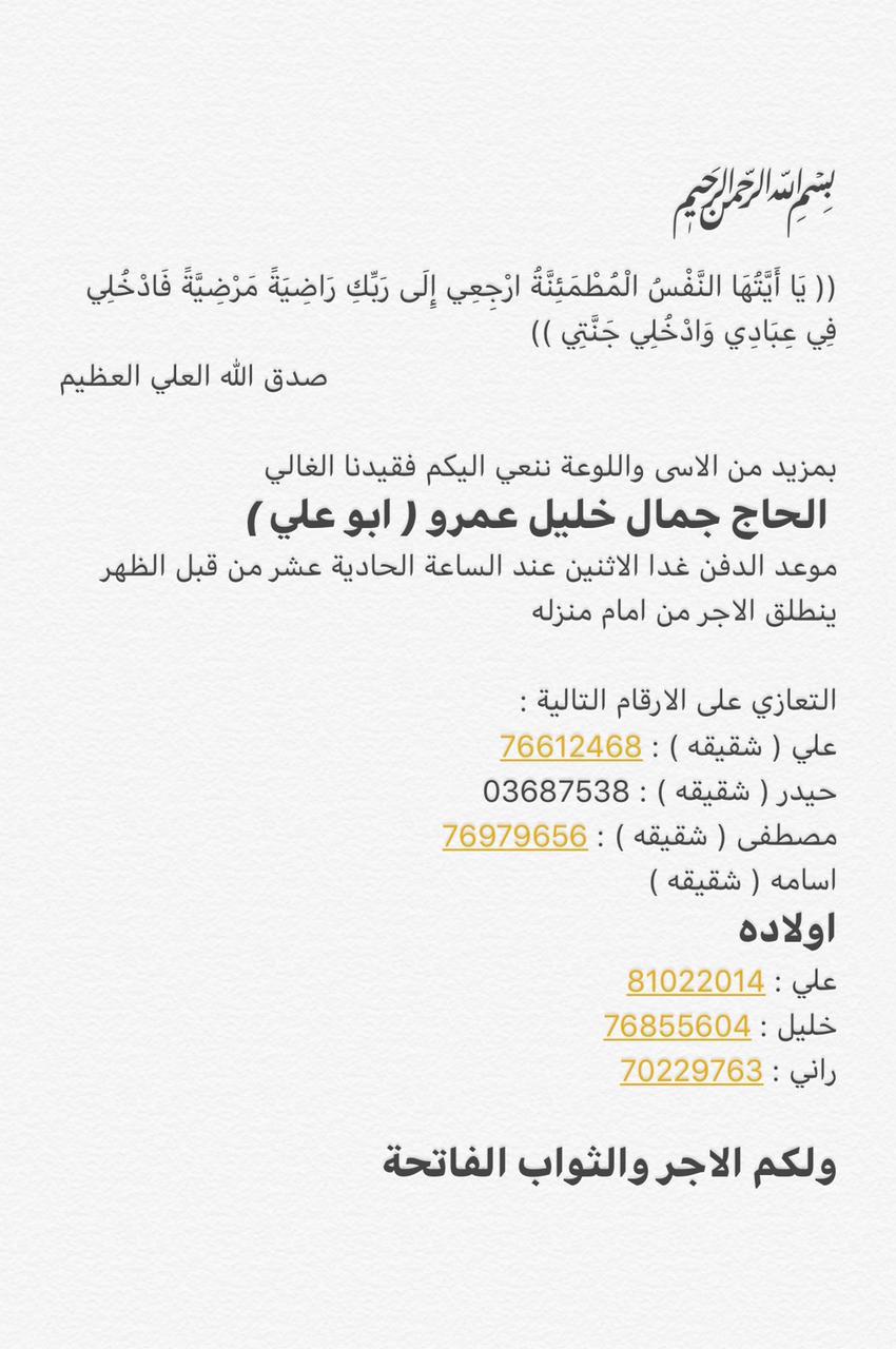 وسيصلى على جثمانها الطاهر غدا الواقع في 2/2/2022 عند الساعة الثانية من بعد الظهر في جبانة روضة الشهيدين – الغبيري تقبل التعازي قبل الدفن اعتبارا من الساعة الثانية عشر والنصف ظهرا في حسينية روضة الشهيدين
